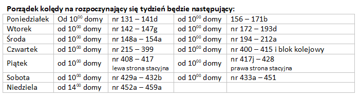 Ten porządek kolędy jest wywieszony w gablocie i umieszczony na stronie internetowej parafii. Do kolędy przygotowujemy: stół nakryty białym obrusem, krzyżyk, zapalone świece, wodę święconą. Woda święcona jest dostępna w zakrystii. W przyszłą niedzielę planujemy zakończyć kolędę. Gdyby ktoś chciał poprosić o kolędę indywidualnie, bo nie mógł przyjąć jej wcześniej, proszę się z nami skontaktować.