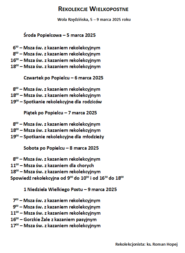 Rekolekcje Wielkopostne 5-9 marca 2025 roku